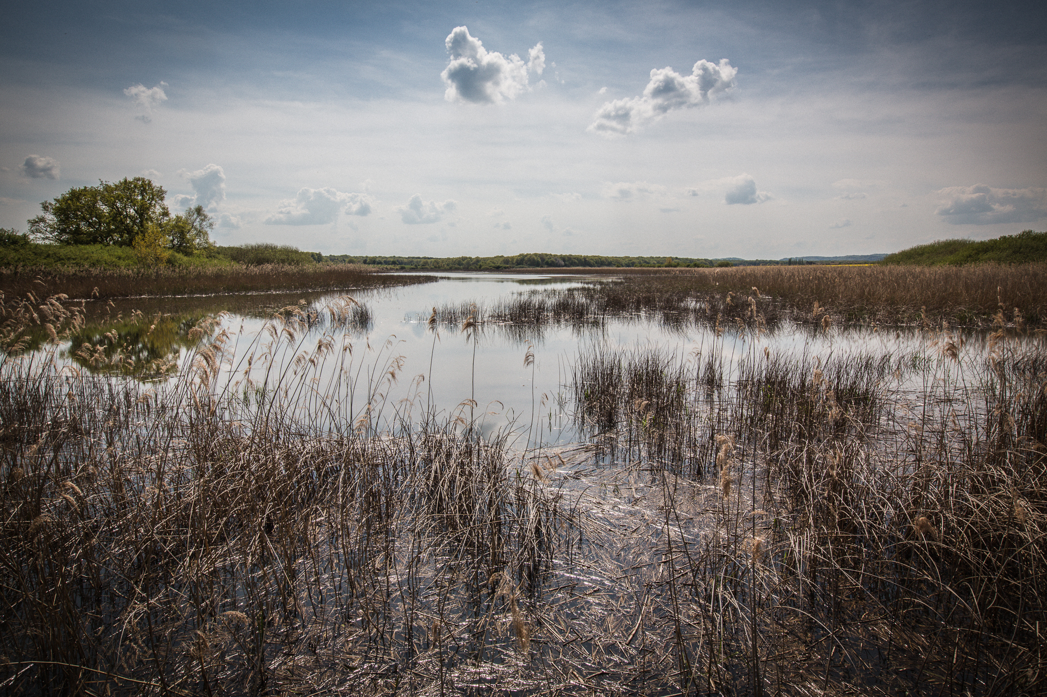 Les premiers kilomètres s’effectuent sur un petit chemin longeant une grande ligne droite de la D131. Rien d’exceptionnel, mais l’absence de voitures contribue à conserver le caractère bucolique de la balade. La première étape du parcours est un observatoire ornithologique construit aux abords de l’étang (repère C). La construction est nouvelle et complètement adaptée à l’observation et la photographie des oiseaux. Malheureusement la lumière de milieu d’après midi n’est pas idéale et à cette heure, seuls 2 cygnes daignent pointer le bout de leur nez.Les rainettes vertes sont quant à elles bien moins discrètes que les oiseaux et leurs chants nous surprennent par leur puissance. On imagine sans mal assister à un lever de soleil à cet endroit, avec une petite brume matinale, cela doit être magique !